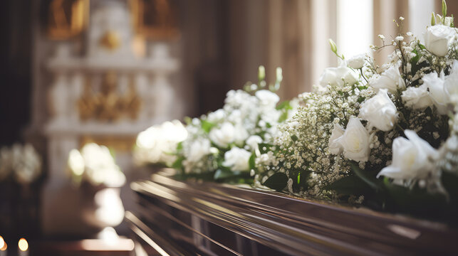 Closeup of modern Coffin in the church with fresh flowers, candles, funeral ceremony. Organization of funerals, farewell to the dead, funeral service.