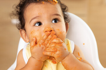surprised kid sitting at table. child's eyes widened and mouth opened in amazement. copy space for your text
