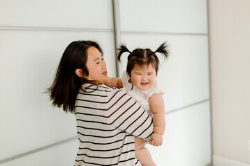 Laughing Asian baby with happy mom