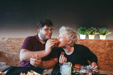 Smiling man feeding funny female friend with delicious burger while sitting at table in fast food cafe