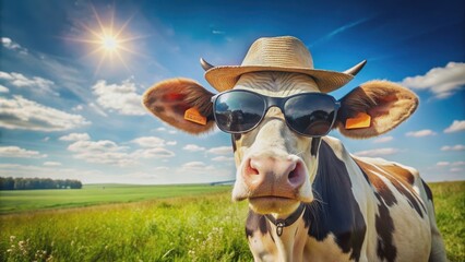 Funny cow wearing sunglasses by swimming pool with grass cocktail. Bovine animal enjoys summer vacation, drink at tropical resort. Humorous concept, leisure, travel, food and beverage.