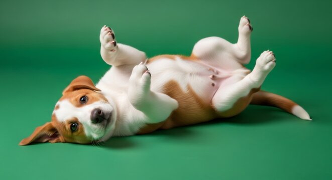 Puppy lying on its back on green screen background. Happy pet playing. Dog chroma key effect for design element.
