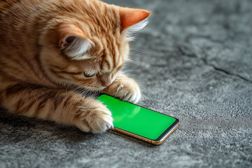 Funny portrait of cat holding paw with chromakey phone on floor, touching, pressing, clicking and swiping with green screen phone. Chroma key mockup for advertising, Cat using smartphone