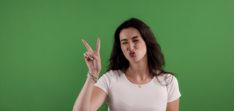 Studio portrait of a young woman making a funny face and showing the victory sign against a green screen backdrop