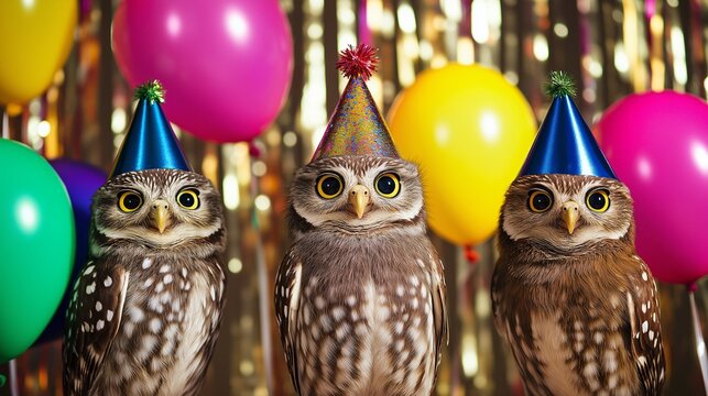 Party owl with balloon backdrop and birthday hat