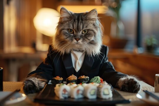 Cat in suit sitting in sushi restaurant and eating