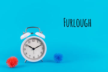 Alarm clock and plastic balls as viruses on the blue background with Furlough wording. Epidemic, social isolation, coronavirus COVID-19 concept. Option with text
