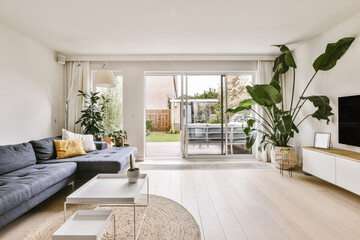 Modern scandinavian interior of living room with design grey sofa, armchair, a lot of plants, coffee table, carpet and personal accessories in cozy home decor. Template.