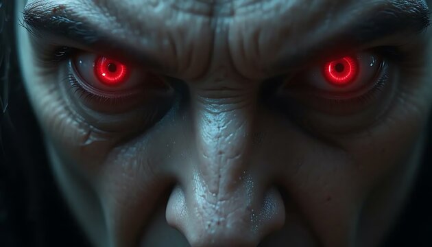 Close-up of a menacing face with furrowed brows and intensely glowing red eyes conveying dread.