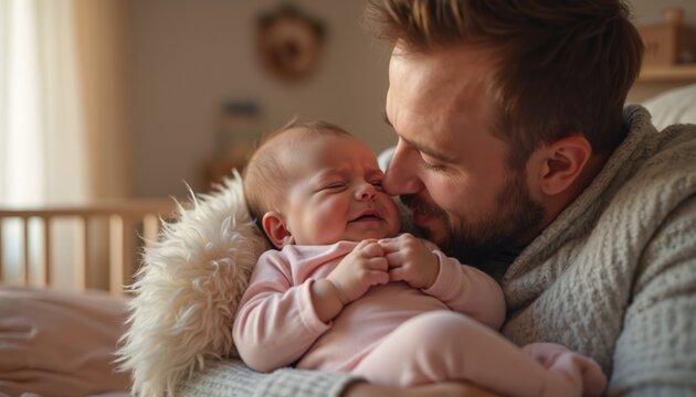 Father gently holds fussy baby offering comfort. Dad soothes crying infant with love and care. Tender family moment indoors, showing parental bonding and challenges.