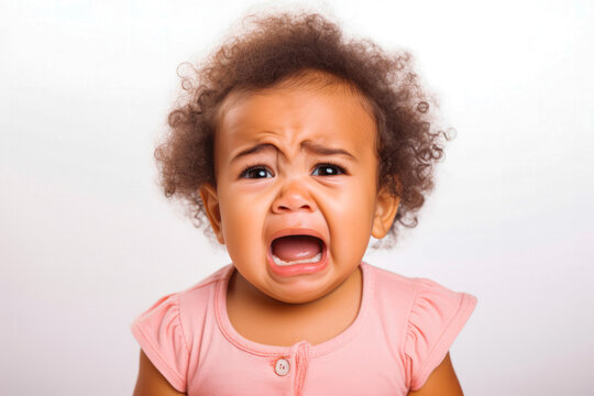 Cute little baby mixed race, afro american crying and screaming isolated on white background. Close up. Sad and in pain.