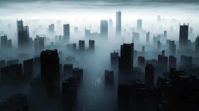 Mysterious urban landscape a haunting vision of a fog-cloaked cityscape at dawn evoking themes of isolation and futility