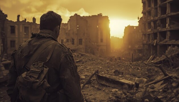 Dusk of Desolation: A Sepia-Toned Image - A Soldier Amidst a Ruined City at Dusk, Poignantly Highlighting the Futility and Sorrow of War.