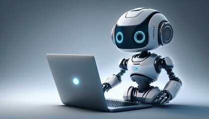 cute friendly artificial intelligence robot using laptop computer with white neon glow light light grey background chatbot and ai assistant concept futuristic technology 3d illustration banner