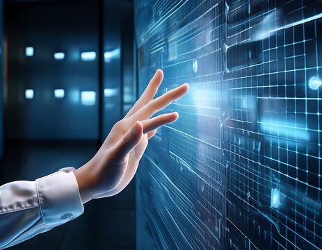 a semi artificial hand reaches out to a futuristic wall wall is made of smooth tiles and has a modern design concept of communication and interaction futuristic data technology