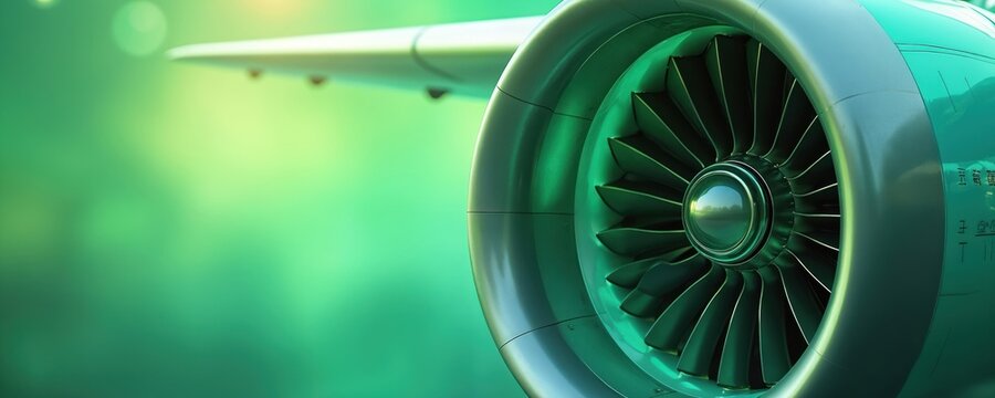 Close-up of aircraft turbine engine in green, blue hues. Eco aviation sustainable fuel concept. Renewable energy, biofuel mix. Modern jet technology, alternative transport, environmentally friendly