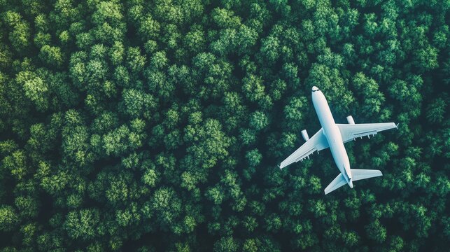 Sustainable aviation fuel concept of flight running on biofuel green energy An aerial view of an airplane flying over green forest the environmental impact and sustainability in the travel industry