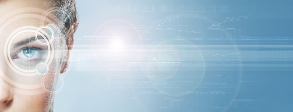 Young and attractive woman from future with the laser hologram on her eyes. Ophtalmology and eye scanning technology.
