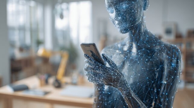 Advanced humanoid robot interacting with smartphone in contemporary office space, showcasing integration of robotics and mobile technology in future work environments