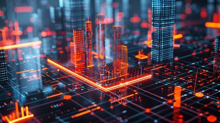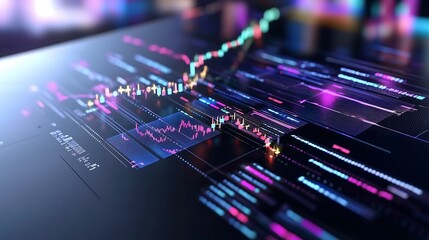 Data Stream Ascent: A dynamic 3D rendering of a vibrant upward trending graph, set against a backdrop of glowing digital particles, symbolizing growth, progress, and technological advancement.