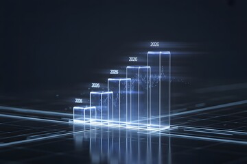 Abstract futuristic glowing blue bar graph rising upwards on a dark reflective surface symbolizing financial growth and success in the digital age