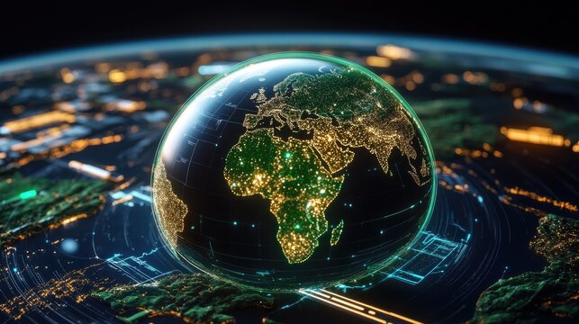 Digital globe with illuminated continents and data points, showcasing futuristic representation of world. vibrant blue and orange colors create striking visual effect