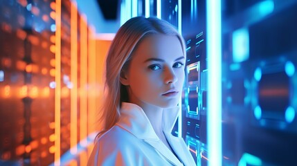 a young woman with contemplative gaze, holographic interface, neon lighting, combining human and technology, futuristic quantum computer server room, advanced AI research center. generative AI