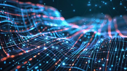 Abstract digital landscape of connected glowing blue and red nodes forming wave-like hills under dark background
