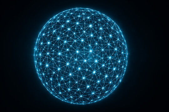 Rendered blue sphere encased in a network, lit with glowing accents, black background