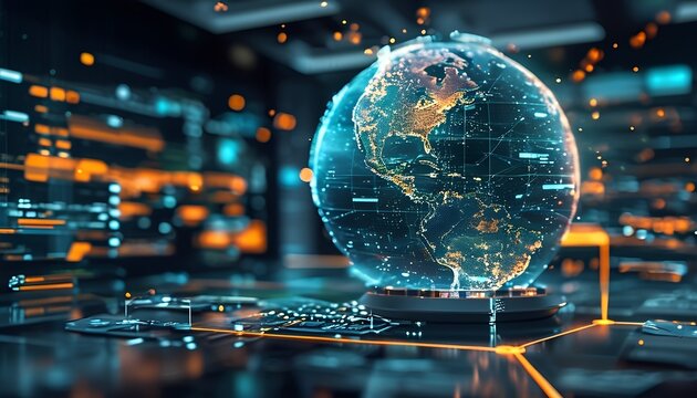 digital Earth hologram with blue neon lights, showcasing global network. globe is surrounded by glowing dots, representing connectivity and technology
