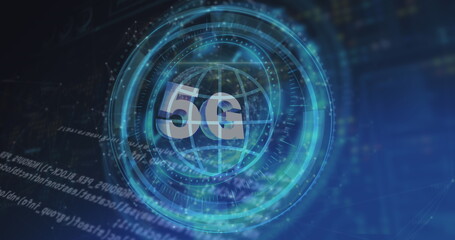 Image of silver text 5g 5th generation, with glowing globe and data processing on red background