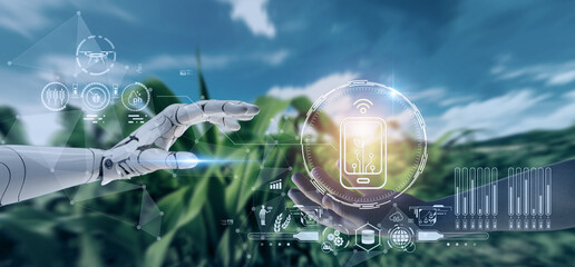 Smart farming, Agricultural transformation technology concept. Robot and human hands touching on data augmented mixed virtual reality integrate artificial intelligence combine deep, machine learning.