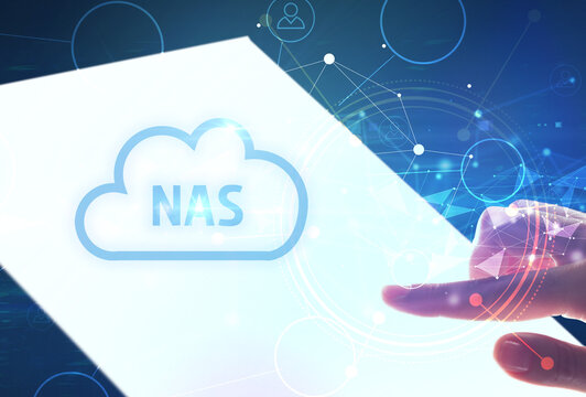 Hand holdig futuristic tablet with NAS inscription, modern technology concept