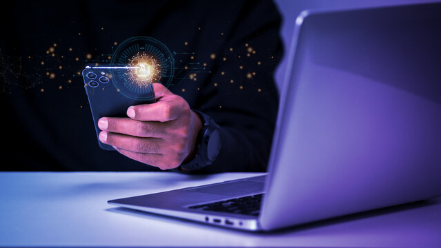Futuristic AI cybersecurity system with glowing shield, secure 5G cloud network, and data protection analytics on laptop. Concept of digital security and technology innovation.