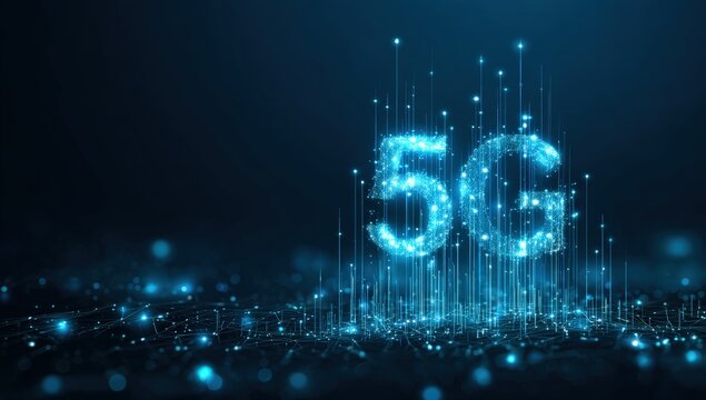 Glowing 5G network symbol illuminating a futuristic digital city, representing high-speed communication and data transmission