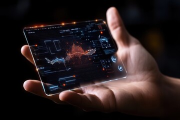 Futuristic Transparent Smartphone Displaying Data Analytics and Graphs in Hand