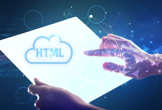 Hand holdig futuristic tablet with HTML inscription, modern technology concept