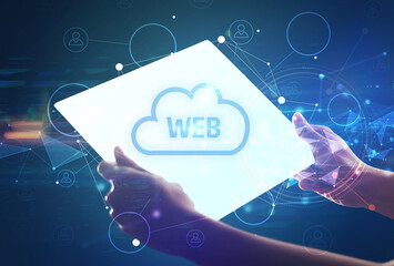 Hand holdig futuristic tablet with WEB inscription, modern technology concept