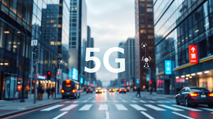 Digital illustration showcasing 5G smart technology in a futuristic environment with glowing network symbols and digital connectivity elements