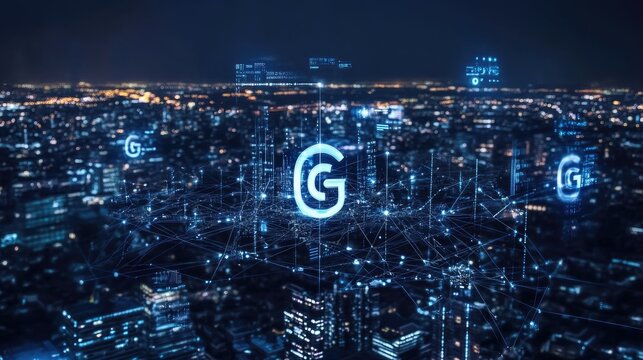 Futuristic cityscape with 6g neon lights and digital grid technology