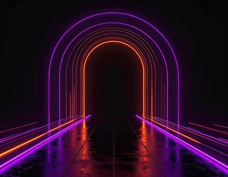 Futuristic tunnel illuminated with vibrant pink, blue, purple, and orange neon lights creating a glowing symmetrical pathway with reflective tiled floor