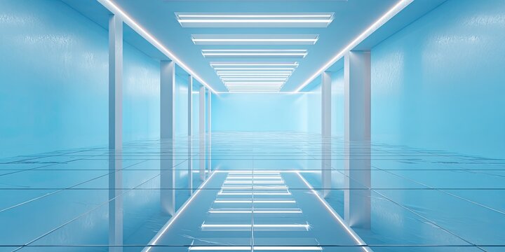 Interior view of a futuristic, minimalist corridor with bright, cool lighting and reflective floors