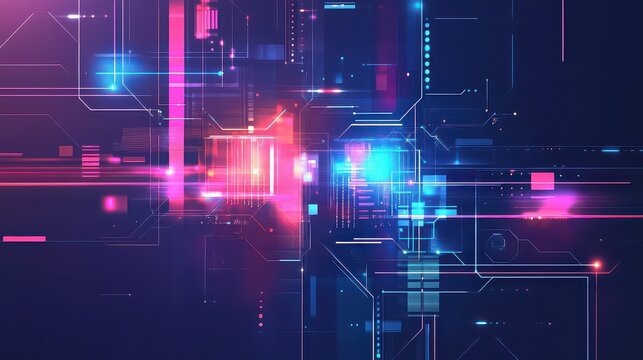 Vibrant and dynamic digital abstract background featuring futuristic geometric shapes glowing lines and particle effects representing technological processes network connectivity