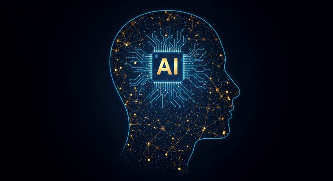 Digital AI chip merges with abstract technology brain design, showcasing vibrant colors and intricate patterns against a dark blue backdrop. Generative AI