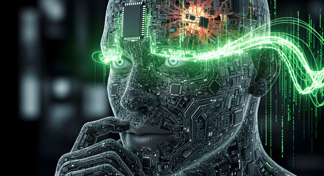 Futuristic AI humanoid head with glowing circuits, data streams, and neural activity. Concept of artificial intelligence, digital mind, and advance...
