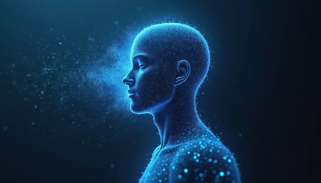 Digital human head profile, rendered in low poly style with glowing blue particles. Abstract concept for AI, mind, thought, and consciousness. Futuristic human silhouette.