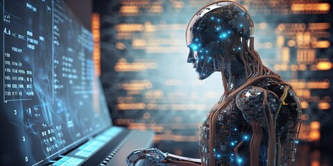 Artificial intelligence in humanoid head with neural network thinks. AI with Digital Brain is learning processing big data, analysis information. Face of cyber mind. Technology background concept.