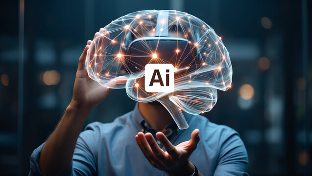 Person wearing VR headset with glowing AI brain network overlay and Ai logo artificial intelligence