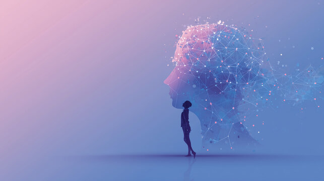 Abstract illustration of artificial intelligence collaborating with humans, soft glowing nodes and connecting lines forming a brain shape, human silhouette integrated with digital elements.