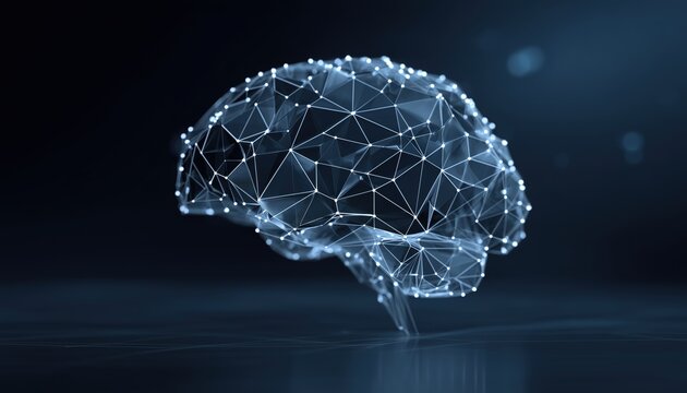 Abstract Polygonal Human Brain Shape Of Artificial Intelligence With Dots And Shadow On Dark Blue Background In Technology.